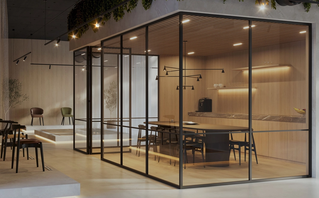 A Divina üvegfalrendszerrel az acélos megjelenés és a modern megoldások találkoznak. A speciális sarokprofiloknak köszönhetően nemcsak falakat, de komplett helyiségeket is építhet. Ráadásul a mindössze 38 mm széles sarokprofil igazán diszkrét és elegáns.